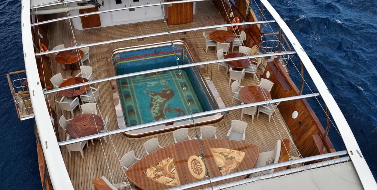Teknenin dikkat çeken özellikleri arasında mozaik tabanlı, yüksekliği ayarlanabilen tasarım bir havuz, tarihi bir bar, panoramik manzaralı ve şömineli master süit yer alıyor. 42 kişilik geniş yemek salonu, şık davetler için ideal bir ortam yaratırken; iki profesyonel spa terapisti ile tam anlamıyla rahatlamanızı sağlayacak bir deneyim sunuyor. Jetski, kano ve paddleboard gibi birçok deniz oyuncağıyla donatılmış olan CHRISTINA O, eğlence ve keyfi bir arada yaşatmak için tasarlanmıştır.