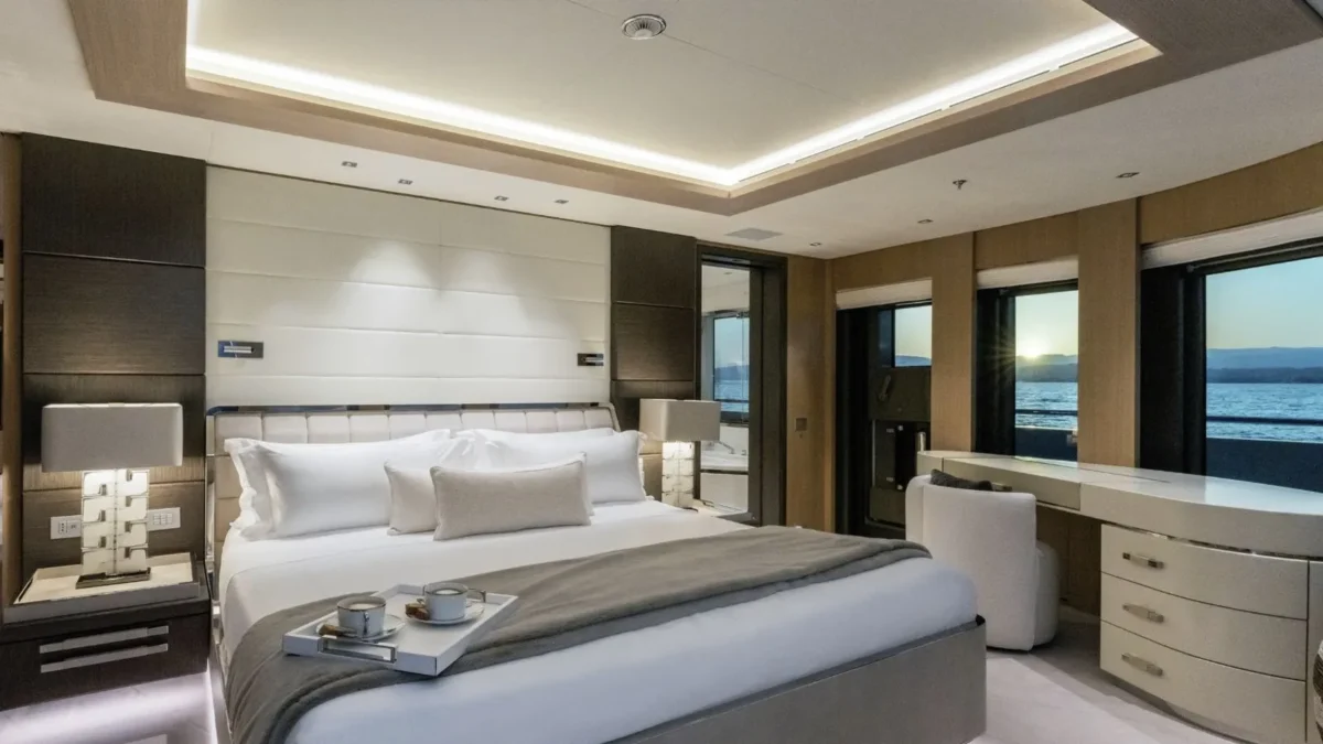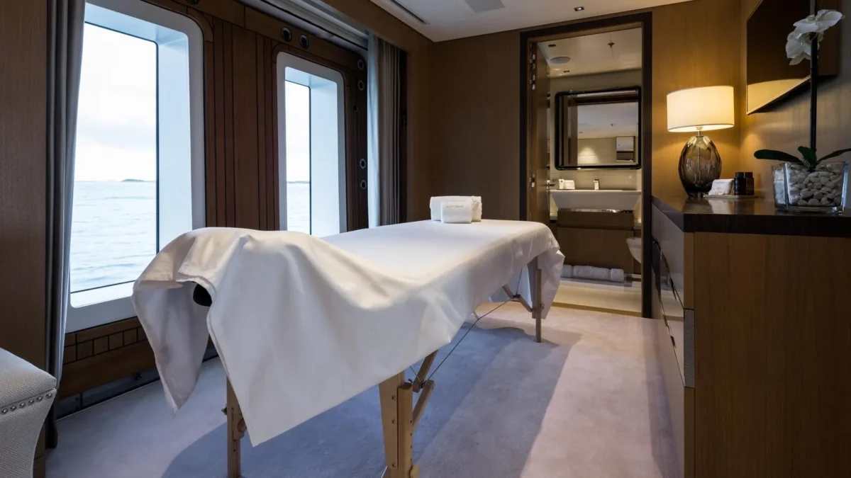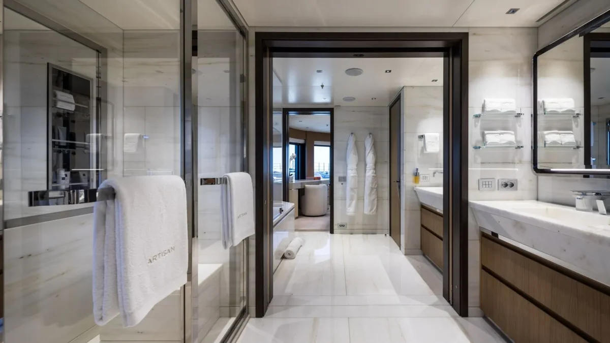 ARTISAN accommodates up to 12 guests in six plus one exquisitely designed cabins. At the heart of the accommodations is a breathtaking 1,722 sqft (160sqm) master suite, a true retreat complete with a private forward deck, an owner’s office, two dressing rooms, two interconnected bathrooms with separate steam showers, and a sophisticated lounge area. The main deck VIP cabin has an Emperor bed convertible to two single beds and features an ensuite with a separate shower, toilet, and bidet. This cabin also adjoins a seventh cabin with a small double bed, a private fold-out balcony, and an en suite shower room, which can be converted into a massage room. (Please note that this cabin can be accessed either through the VIP or the crew quarters, so it’s recommended for families and staff only). The lower deck features four spacious VIP cabins, each with super king-sized beds, en suite shower rooms, toilets, and bidets. Additionally, the two forward cabins are equipped with one pullman berth each.