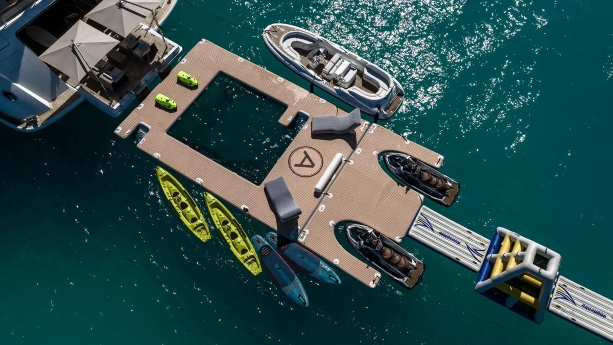 For fitness and wellness enthusiasts, the sixth-level gym and yoga deck provide panoramic views, creating an inspiring setting for workouts or meditation. The yacht’s open beach club, enhanced by fold-down terraces, invites relaxation by the water, while an impressive selection of water toys and accessories ensures endless entertainment. Completing this exceptional offering is a brand-new 44 open Fjord chase tender, perfect for exploring coves or islands.